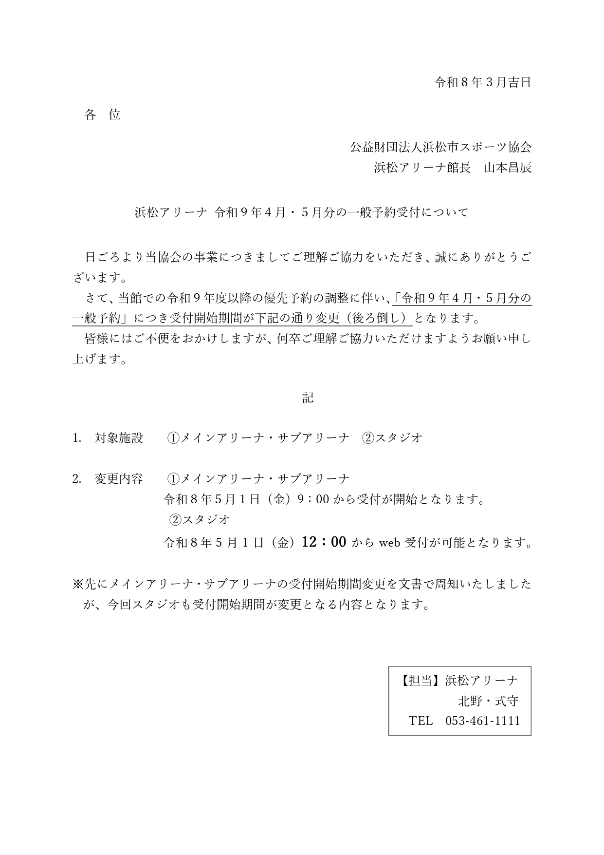 浜松アリーナ 令和9年4月・5月分の一般予約受付について